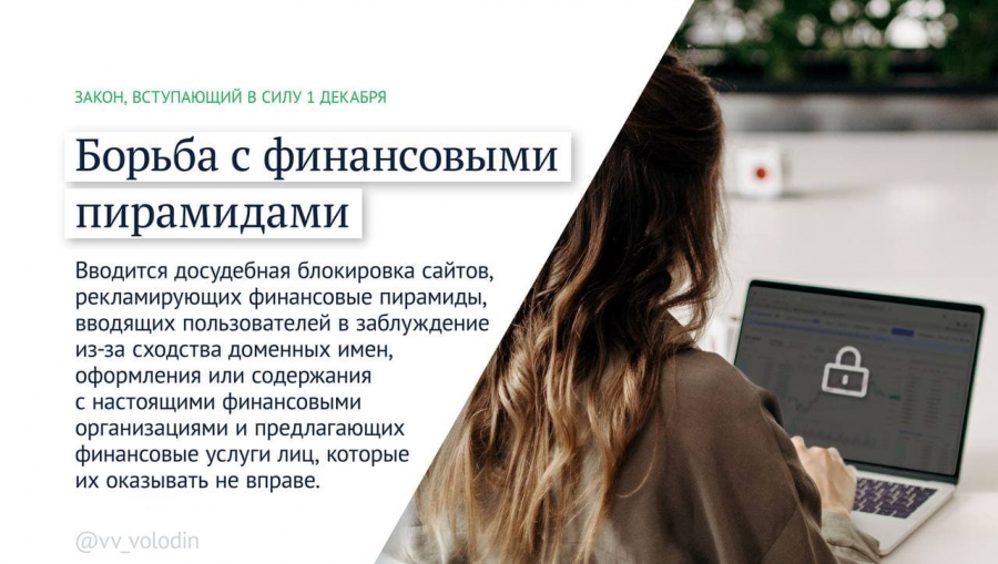 Отдельно спикер отметил ряд законов, касающихся защиты людей в финансовой сфере. Так, появится возможность во внесудебном порядке блокировать сайты, которые выманивают деньги, а потом исчезают. Это решение позволит оперативно пресекать деятельность ресурсов, рекламирующих финансовые пирамиды.