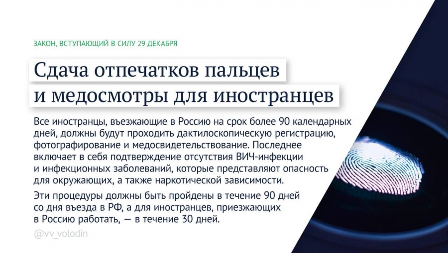 Все иностранцы, въезжающие в Россию на 90 дней, в течение этого срока со дня въезда в страну должны будут проходить дактилоскопическую регистрацию, фотографирование и медосвидетельствование (в том числе подтверждение ВИЧ-инфекции и инфекционных заболеваний). Приезжающим на работу на это будут отводить 30 дней.
