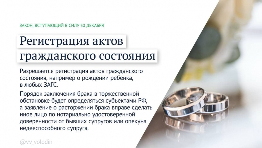 Разрешается регистрация актов гражданского состояния, например, о рождении ребенка, в любых ЗАГС, а заявление о расторжении брака от лица одного из супругов вправе сделать человек, у которого будет нотариальная доверенность от него или опекуна недееспособного супруга.