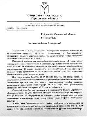 Общественная палата Саратовской области обратилась к губернатору Роману Бусаргину с предложением ввести дополнительную ответственность в отношении компании «Т Плюс» из-за неудовлетворительной работы. Соответствующее обращение подписано председателем ОП Борисом Шинчуком. Как сказано в документе, к ресурсоснабжающей организации «Т Плюс» возник ряд претензий, основанных на обращениях населения.