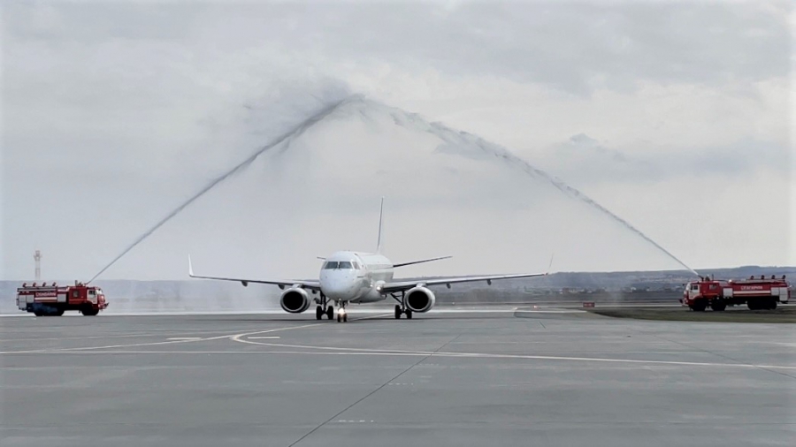 Первый рейс по авиационной традиции на перроне аэропорта встретили «водной аркой» из пожарных аэродромных машин.