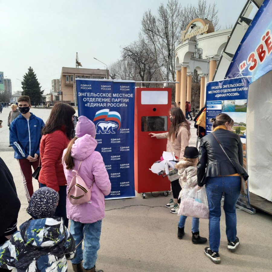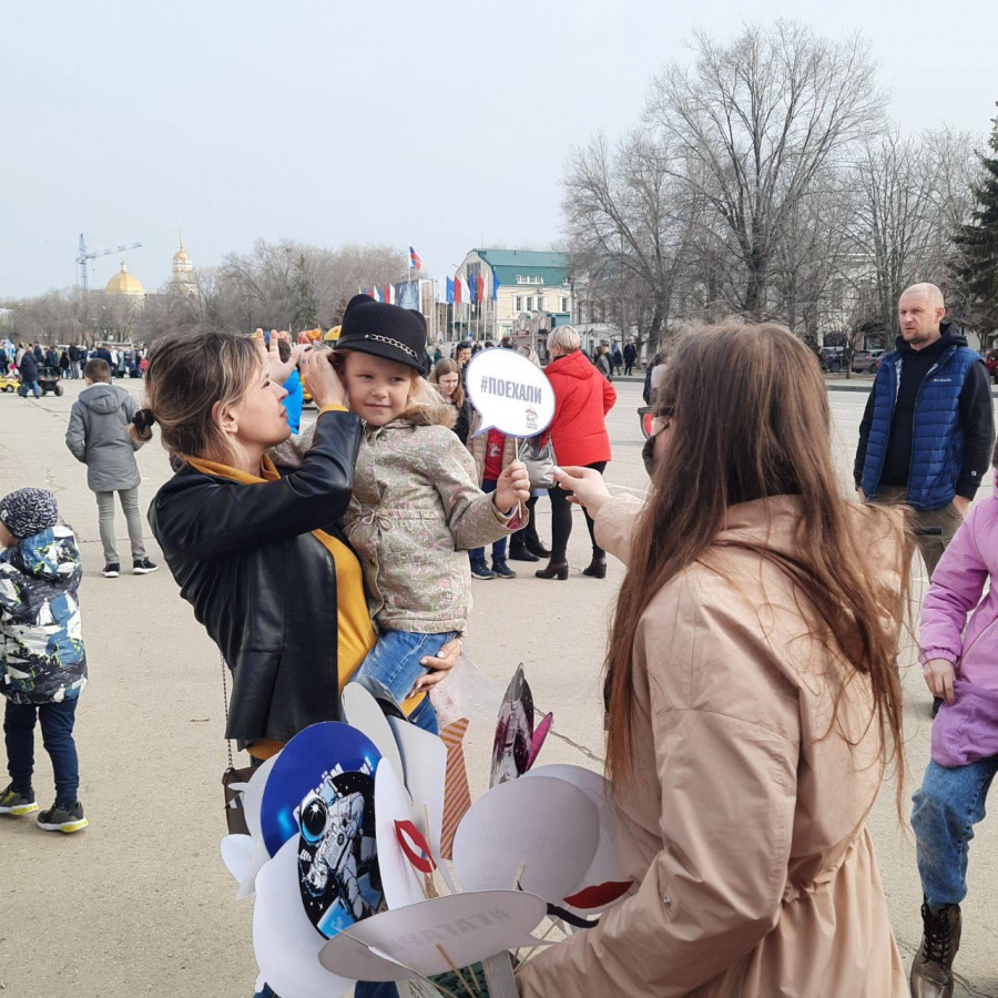 На главной площади города Энгельс были организованы тематические фотозоны, выставка «Открытый космос» и «Звездный кинозал». Местное отделение партии «Единая Россия» организовало для детей и взрослых площадку, на которой каждый житель смог бесплатно получить свою фотографию на память в космической тематике.
