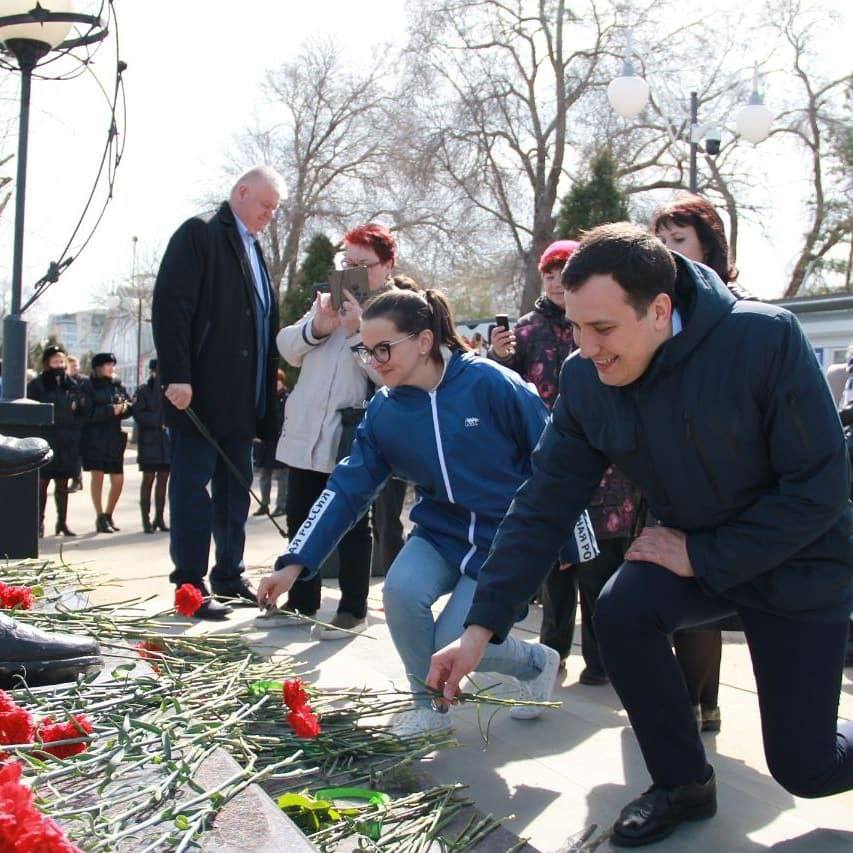 На торжественном митинге-концерте, прошедший 12 апреля, партийцы приняли участие в возложении цветов к памятнику «Перед полетом».
