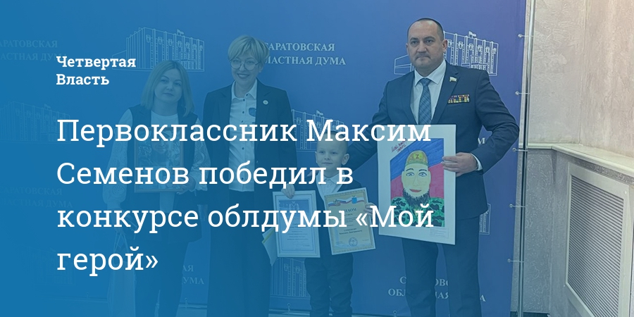 В Саратовской областной думе подвели итоги патриотического конкурса детского рисунка «Мой герой». По информации уполномоченного по правам ребенка Татьяны Загородней, победителем стал первоклассник Максим Семенов.