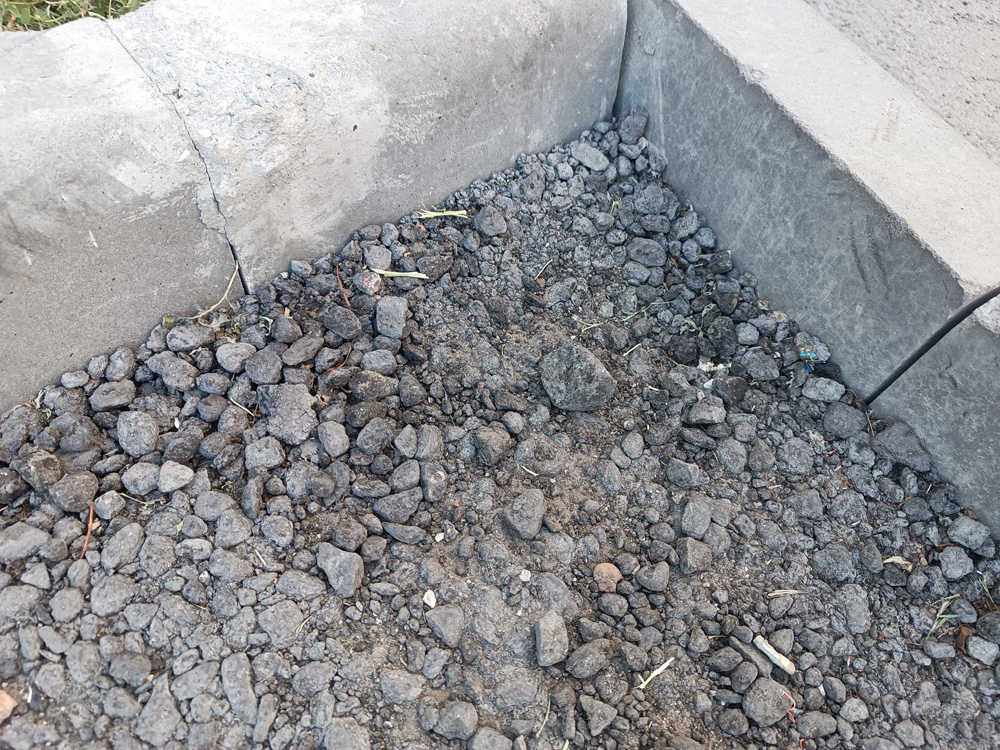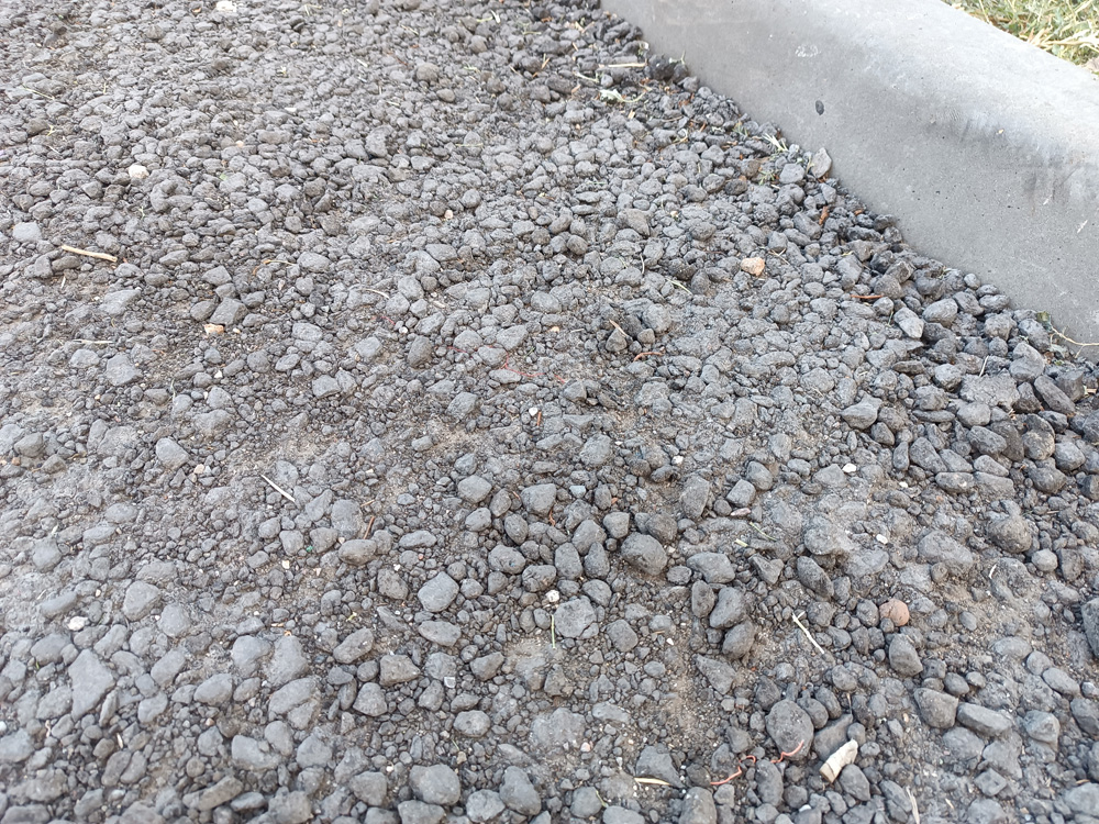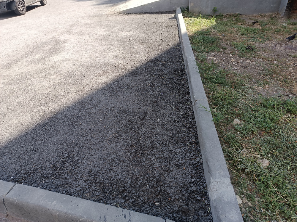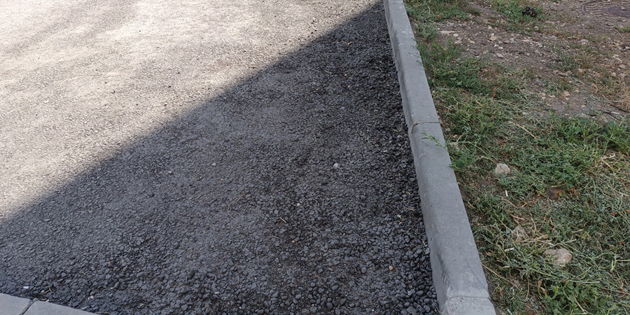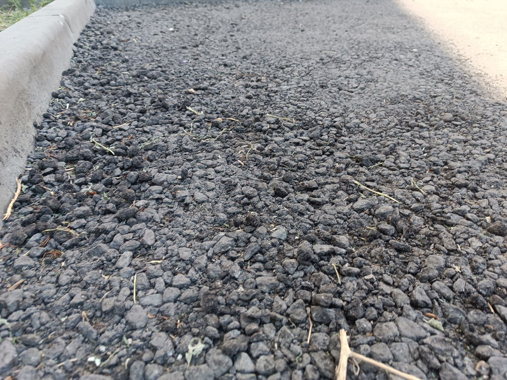 Выкрашивание, а фактически разрушение асфальтобетонного покрытия встречается по всему периметру небольшой заасфальтированной территории одноподьездного дома. Местами щебень можно спокойно взять в горсть, настолько раскрошился асфальт.