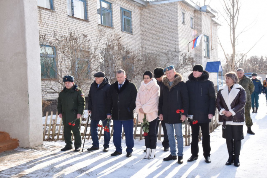 Торжественное открытие состоялось на фасаде школы села Хлебновка. Присутствующие почтили память героя минутой молчания и возложили к мемориалу цветы.