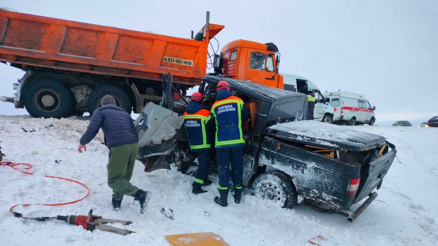 «Спасатели областной службы спасения при помощи гидравлического инструмента деблокируют пострадавших и тело погибшего мужчины. Водитель «КамАЗа» не пострадал», - отметил Юрий Юрин.