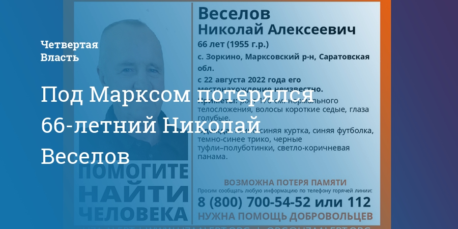 В Марксовском районе Саратовской области без вести пропал 66-летний Николай Веселов. К его поискам подключились волонтеры отряда «Лиза Алерт».