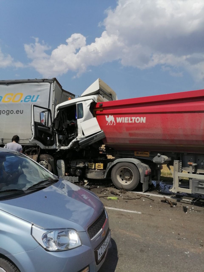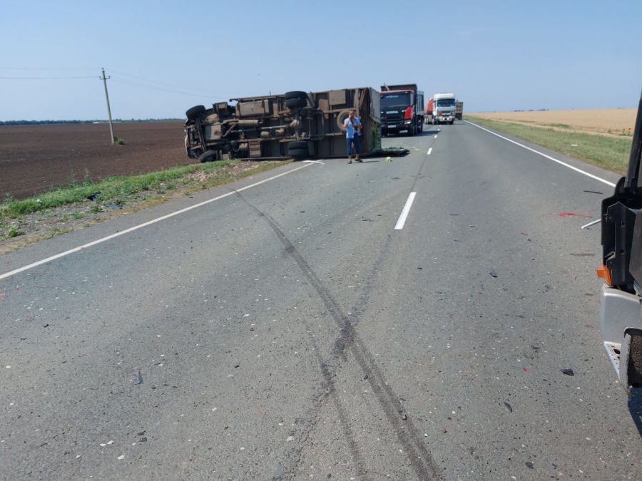 По предварительным сведениям, около 11.55 на дороге у села Новокривовка столкнулись автомашины «Фольксваген Туарег», «ГАЗель», а также грузовики «Вольво» и «МАН». При этом «ГАЗель», груженая капустой, опрокинулась на бок.