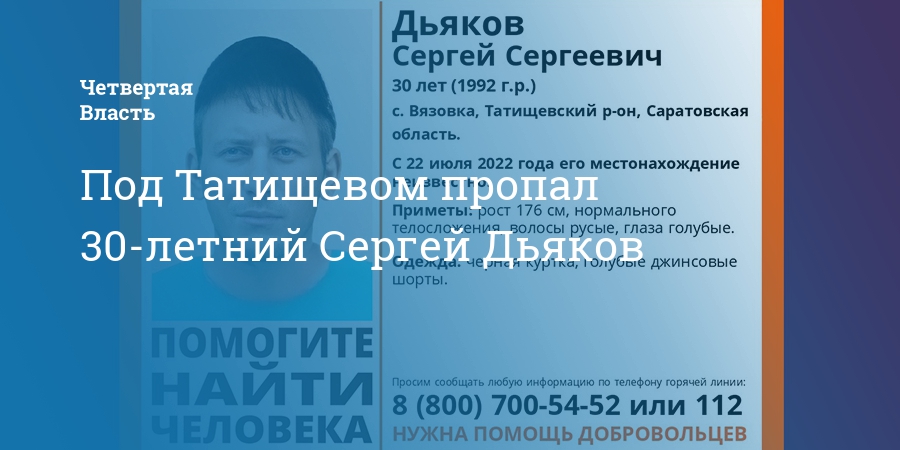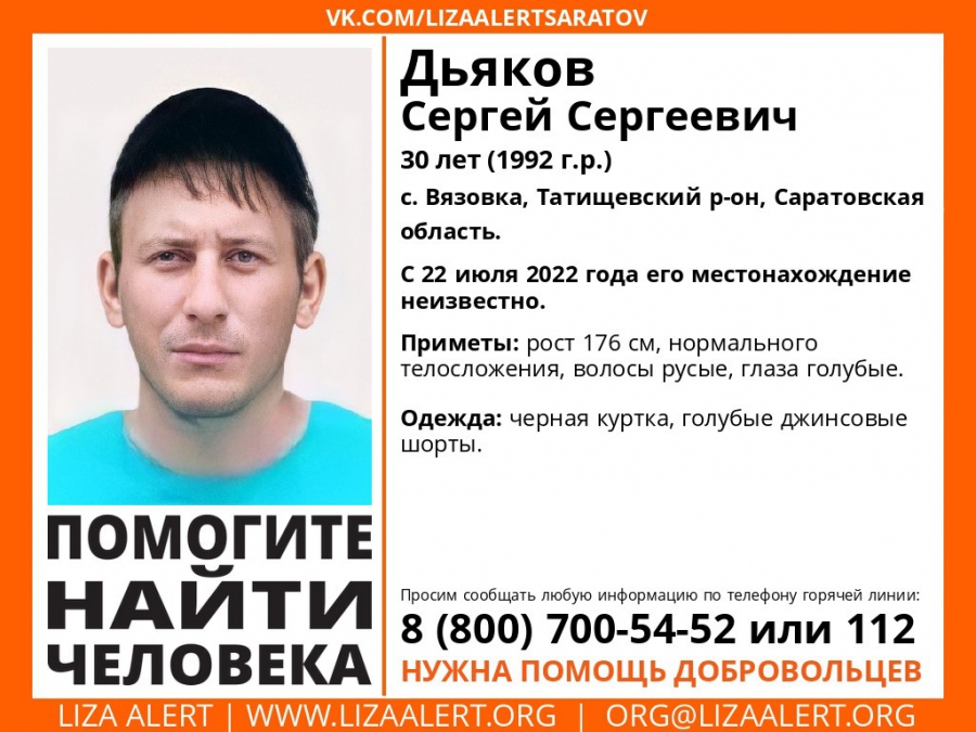 В Татищевском районе Саратовской области без вести пропал 30-летний Сергей Дьяков. Об этом сообщают волонтеры поискового отряда «Лиза Алерт».