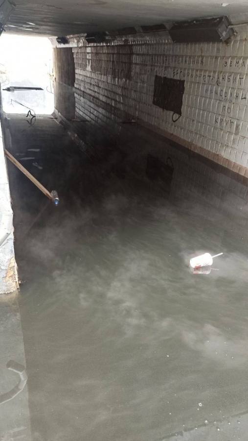 Судя по кадрам с места, подземный переход все еще затоплен, причем от воды поднимается пар. Предположительно, подтопление может быть связано с коммунальной аварией. При этом никаких ограждений и предупреждающих знаков возле подземного перехода нет, только доски плавают по воде. Учитывая масштабы проблемы, они выглядят ненадежной опорой.
