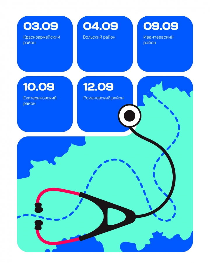 Специалисты «Поезда здоровья» 3 сентября проверят здоровье жителей Красноармейского района в селе Первомайское, на следующий день, 4 сентября, они прибудут в село Барановка Вольского района, 9 сентября навестят Ивантеевку, в Екатериновке будут 10 сентября, а 12 сентября приедут в поселок Алексеевский Романовского района.