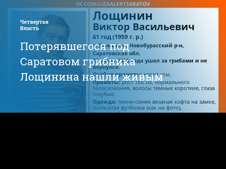 Жителя села Голицыно Новобурасского района Виктора Лощинина нашли живым. Об этом сообщают волонтеры поискового отряда «ЛизаАлерт».