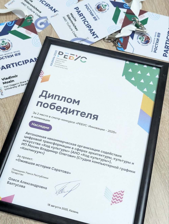 Фестиваль виртуальной реконструкции «Ожившая история Саратова», созданный АНО «Код культуры» и студией «Континуум», получил 2-е место в номинации «Наследие» на Международном конкурсе «РЕБУС: Инновации-2025» в Казани.