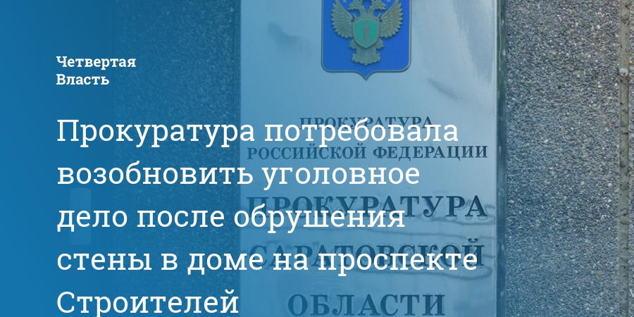 Прокуратура Саратовской области признала незаконным решение о прекращении уголовного дела об обрушении стены в доме на проспекте Строителей. Об этом сообщает региональное надзорное ведомство.