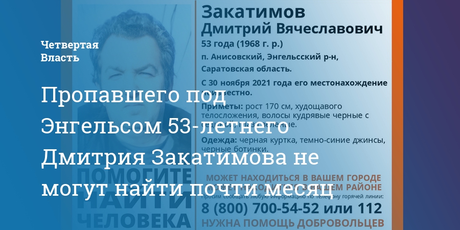 В Энгельсском районе уже почти месяц не могут найти без вести пропавшего 53-летнего Дмитрия Закатимова. Об этом сообщает поисковый отряд «Лиза Алерт».