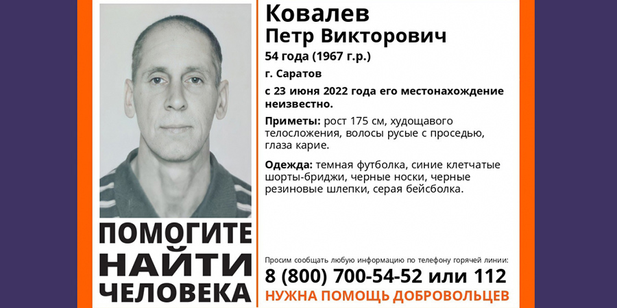 Потерявшийся в Саратове 54-летний Петр Ковалев найден погибшим. Как сообщает поисковый отряд «Лиза Алерт», о его местонахождении ничего не было известно с 23 июня.
