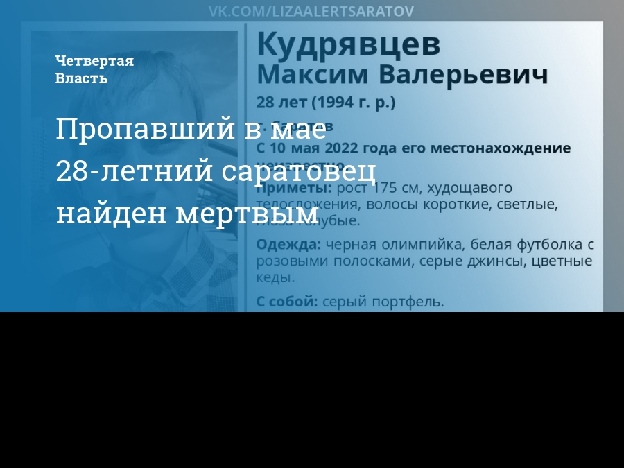 В Саратове перестали искать 28-летнего Максима Кудрявцева», молодой человек найден мёртвым. Об этом сообщили волонтеры поискового отряда «Лиза Алерт Саратов».