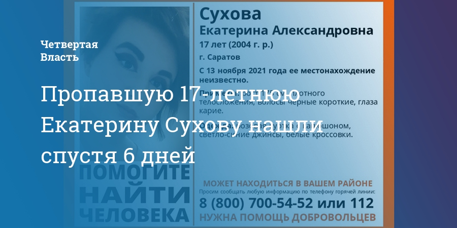 В Саратове найдена живой без вести пропавшая 17-летняя Екатерина Сухова. Об этом сообщили поисковики отряда «Лиза Алерт».