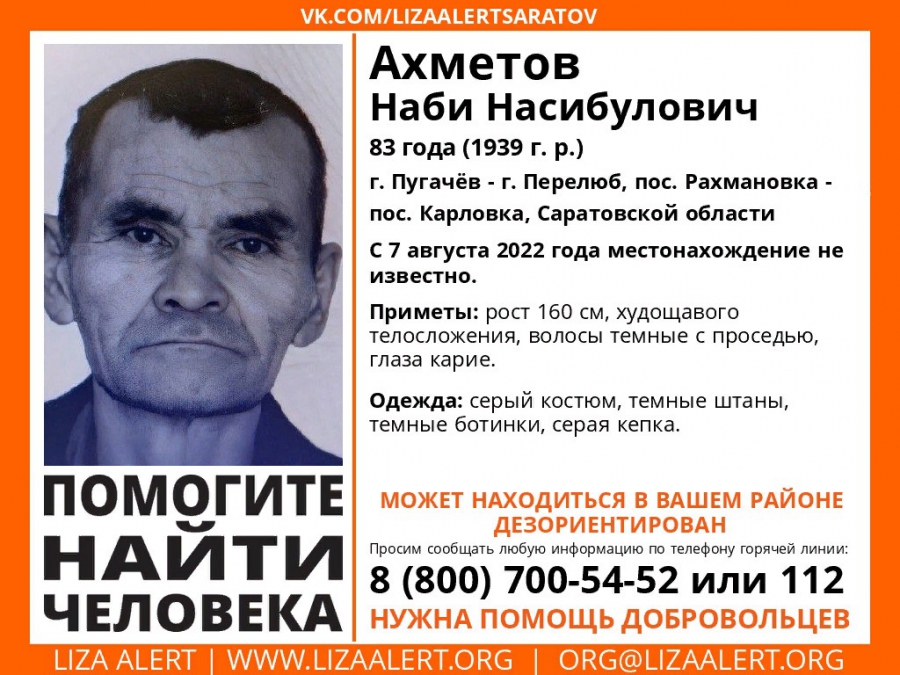 Между тем стало известно о другом пропавшем – 83-летнем Наби Ахметове. Мужчину с 7 августа ищут между Пугачевом и Перелюбом, а также поселками Рахмановка и Карловка. Указывается, что он может быть дезориентирован. Его рост 160 см, он худощавого телосложения, волосы темные с проседью, глаза карие. На нем могут быть серый костюм, темные штаны, темные ботинки, серая кепка.