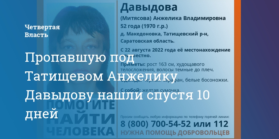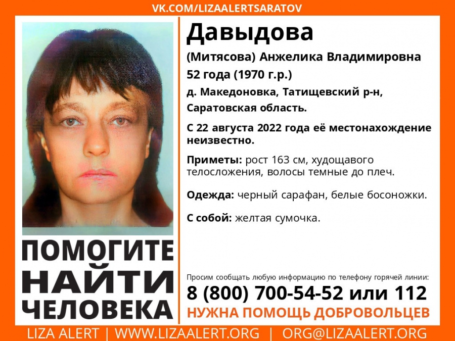 Пропавшая в Татищевском районе Саратовской области 52-летняя Анжелика Давыдова (Митясова) найдена живой. Об этом сообщили поисковики отряда «Лиза Алерт».