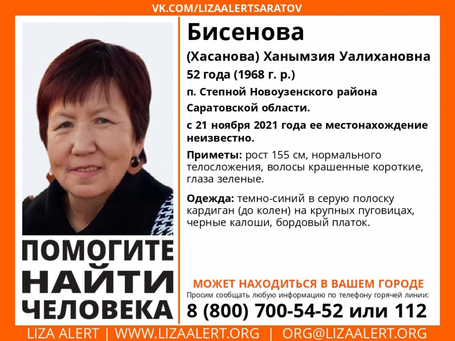В Саратовской области возобновлены поиски Ханымзии Бисеновой (Хасановой) 1968 г.р., которая без вести пропала в ноябре 2021 года. Об этом сегодня, 28 апреля, информирует поисково-спасательный отряд «Лиза Алерт».