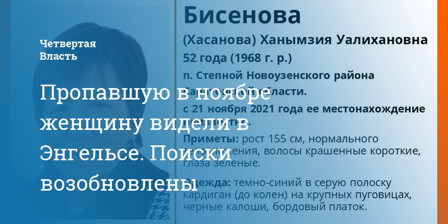 В комментариях появилась информация от Альбины Бисеновой, которая представляется дочерью пропавшей. По ее словам, Ханымзию Бисенову (по-русски – Катя) якобы видели зимой в Энгельсе на Ярмарке, а также на энгельсской трассе у села Безымянное.