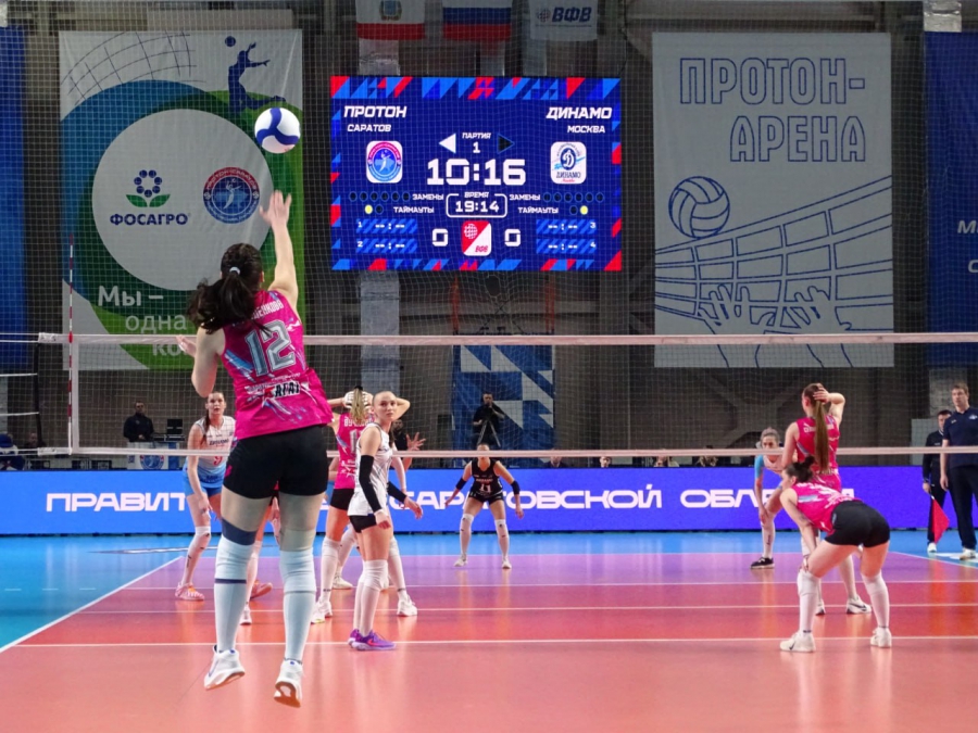 Первая партия «Протону» не удалась - 2:5, 4:9, 6:15. Лишь после счета 12:20 саратовчанки включились и отыграли пять очков - 22:25. Во втором сете сценарий был совершенно противоположным - уже хозяйки площадки ушли в солидный отрыв («+7»). «Динамо» сокращало отставание до «-4», потом пропустило 4 очка подряд - 17:25.