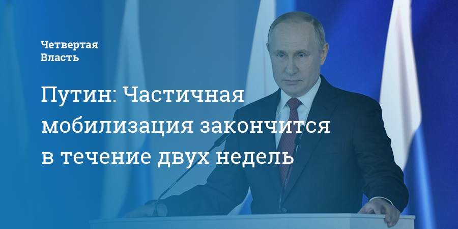 Мобилизация россиян для участия в специальной военной операции на Украине может завершиться примерно через две недели. Об этом сегодня, 14 октября, заявил президент РФ Владимир Путин, отвечая на вопросы журналистов во время визита в Астану (Казахстан).