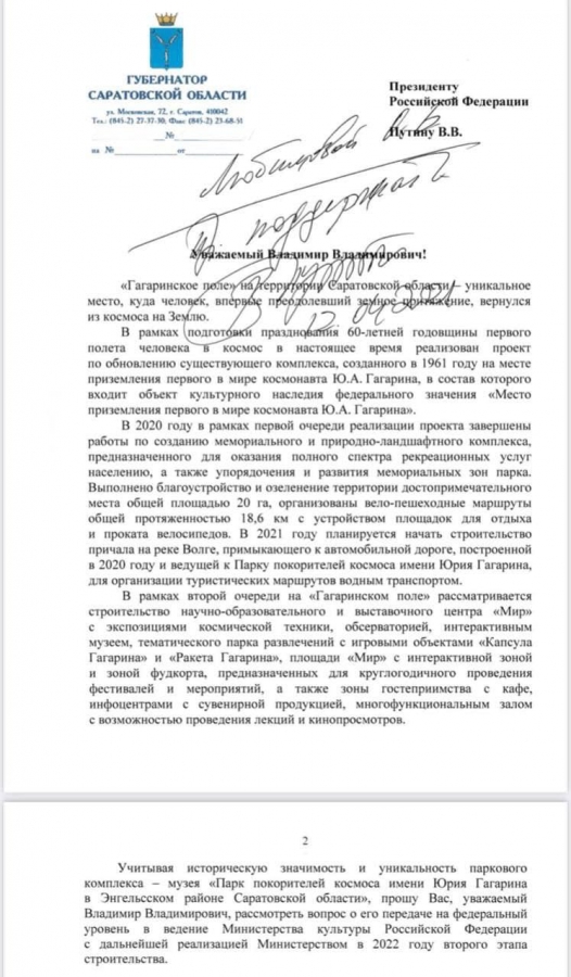 Сторонники спикера представили общественности текст обращения к главе государства от имени губернатора Валерия Радаева. Вначале руководитель региона напомнил об уникальности места, где приземлился первый космонавт планеты Юрий Гагарин. Комплекс, созданный в 1961 году, куда входит объект культурного наследия федерального значения, обновили при подготовке к празднованию 60-летней годовщины первого полета человека в космос. В 2020 году в рамках первой очереди реализации проекта завершили работы по созданию мемориального и природно-ландшафтного комплекса, благоустроили и озеленили 20 Га достопримечательности, организовали вело-пешеходные маршруты протяженностью 18, 6 км и др. В 2021 году хотят начать строительство причала на Волге для туристических маршрутов. В рамках второй очереди на «Гагаринском поле» рассматривается строительство научно-образовательного и выставочного центра «Мир» с экспозициями космической техники, обсерваторией, интерактивным музеем, инфоцентрами, тематическим парком развлечений с игровыми «капсулой» и «ракетой» Гагарина, интерактивной зоной для круглогодичного проведения фестивалей и др.