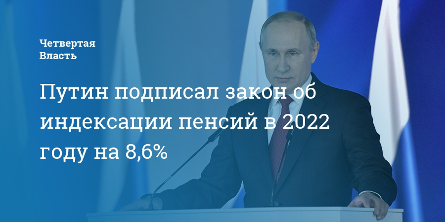 Президент России Владимир Путин подписал закон об индексации пенсий в 2022 году на 8,6%. Документ разместили на официальном портале правовой информации.