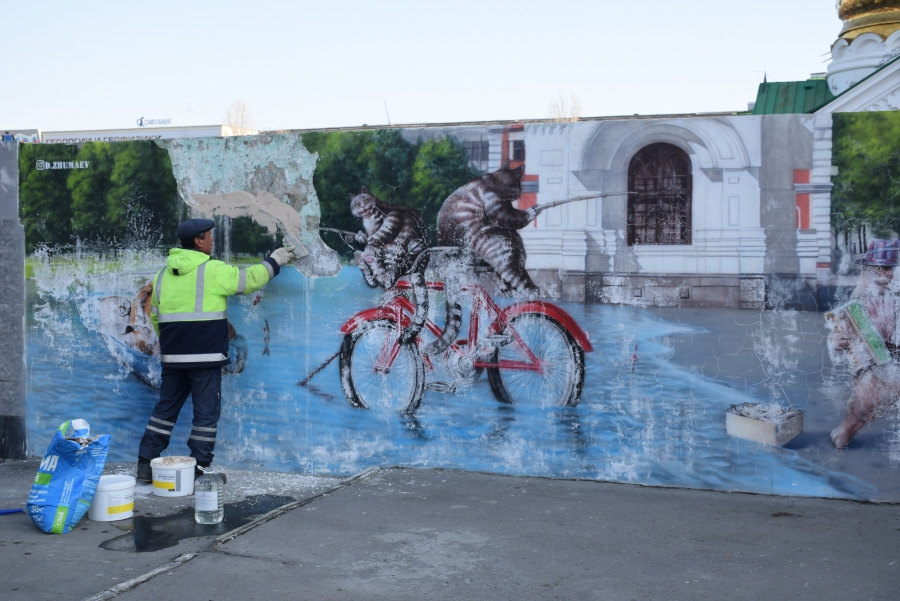 «Пока решили закатать белой краской, а когда будет возможность по погоде – появится новый рисунок, все подробности пока раскрывать не хочу, но элементы старой работы тоже останутся. Город меняется, и рисунок должен соответствовать», – рассказал художник.
