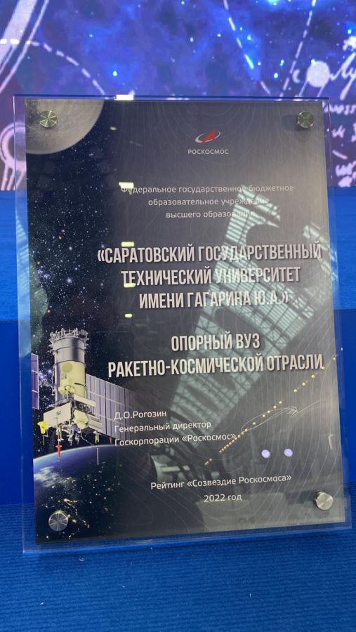 Генеральный директор Госкорпорации «Роскосмос» Дмитрий Рогозин вручил представителям 18 образовательных организаций, оказывающим наибольшее влияние на развитие образовательного и научного потенциала ракетно-космической промышленности, сертификаты опорных вузов отрасли. Обладателем такого сертификата стал и Саратовский государственный технический университет имени Гагарина Ю.А.