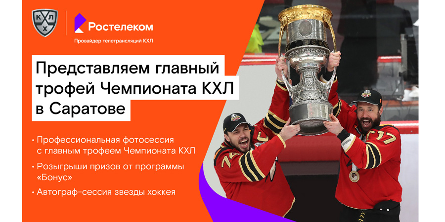 В рамках партнерства Континентальной хоккейной лиги (КХЛ) и «Ростелекома» в Саратове 19 марта в Ледовом дворце спорта «Кристалл» будет выставлен главный трофей Чемпионата КХЛ.