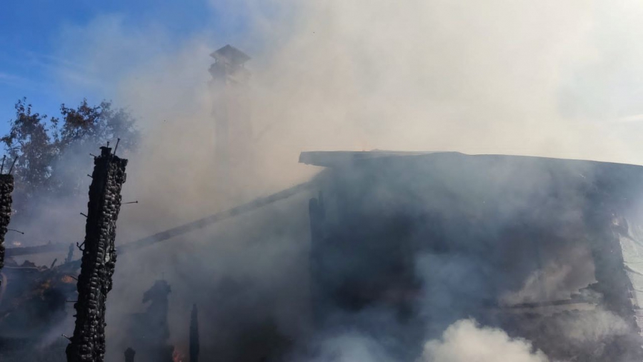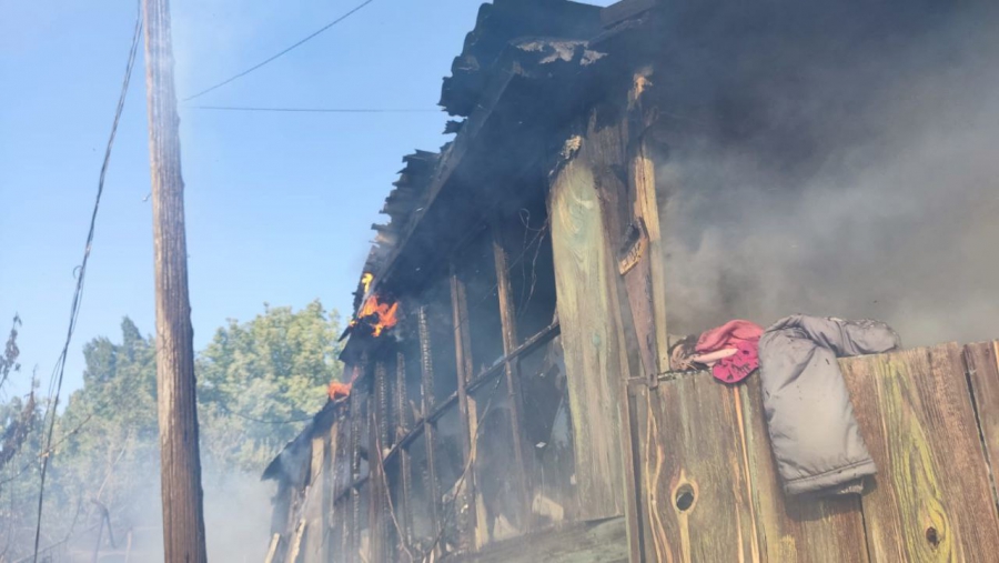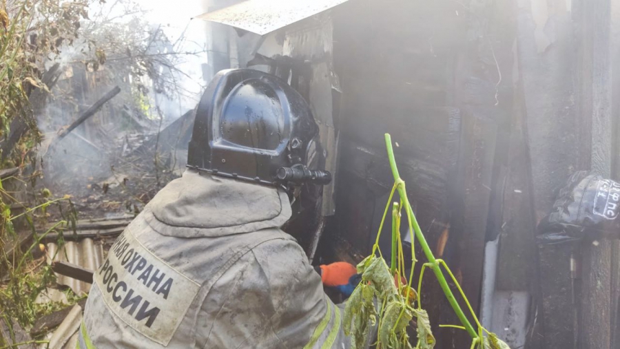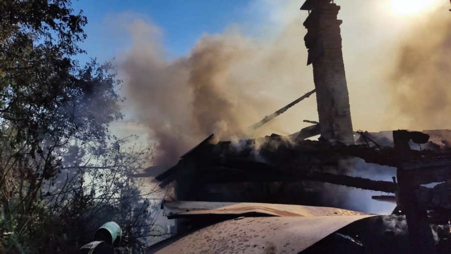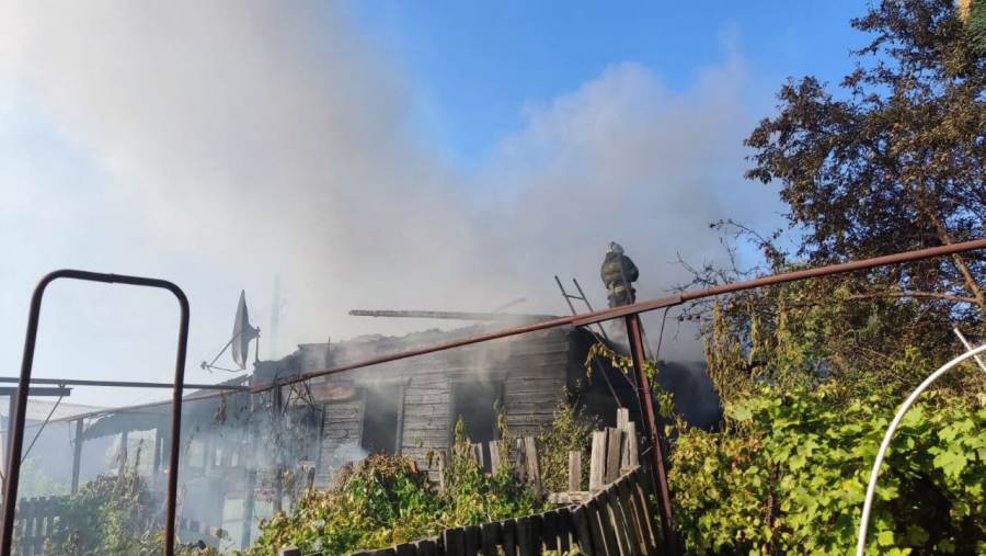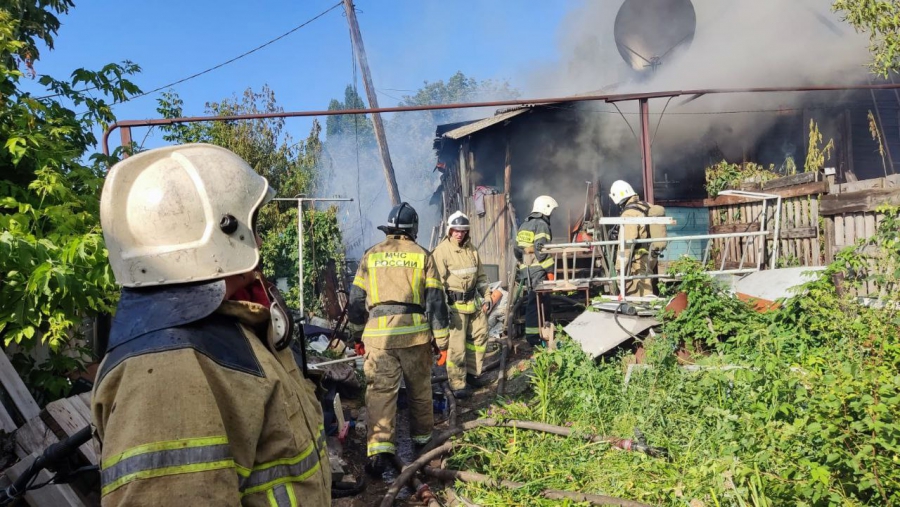 У одноэтажного здания №119 по Соборной (в районе памятника «Журавли» на Соколовой горе) работают пожарные. Они прибыли сюда по повышенному номеру. Пламя охватило строение и надворные постройки на площади 300 кв.м.