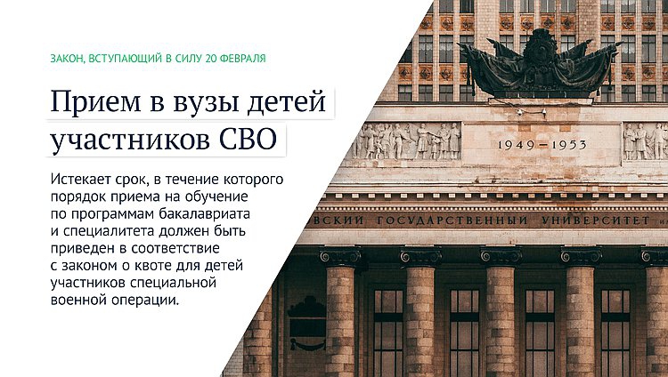 А с 20 февраля дети участников специальной военной операции на Украине смогут поступать в вузы по квоте.