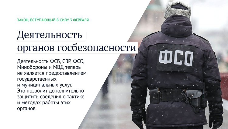 С 3 февраля деятельность органов государственной безопасности (ФСБ, СВР, Минобороны и МВД) больше не является предоставлением услуг, что позволит дополнительно защитить сведения об их тактике и методах работы.