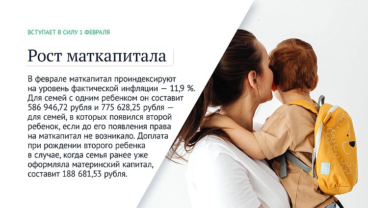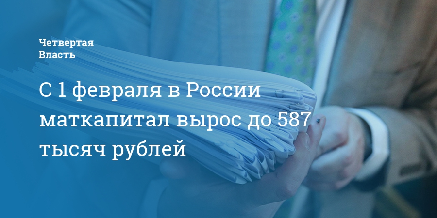 С 1 февраля в России маткапитал вырос до 587 тысяч рублей