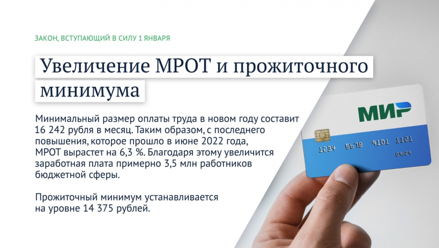 Увеличится МРОТ и размер прожиточного минимума. Таким образом, минимальный размер оплаты труда составит 16 242 рубля в месяц (рост на 6,3% по сравнению с последним повышением). Прожиточный минимум составит 14 375 рублей.