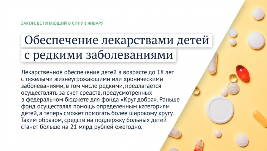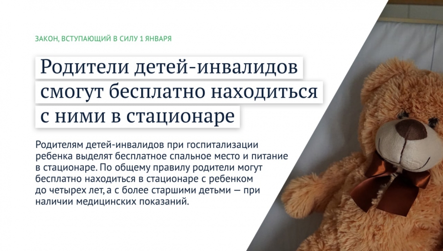 За счет средств федерального бюджета несовершеннолетних с жизнеугрожающими или хронологическими заболеваниями обеспечат необходимыми лекарствами. Ежегодно на поддержку больных детей станет на 21 млрд больше. Кроме того, при госпитализации ребенка-инвалида родитель сможет бесплатно находиться с ним в стационаре (по общему правилу – до 4 лет, при наличии показаний – с более старшими).