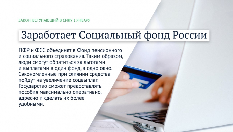 Пенсионный фонд России и Фонд социального страхования объединят в Фонд пенсионного и социального страхования. То есть, за льготами и выплатами граждане смогут обратиться в один фонд, что предоставит более оперативное обслуживание. Слияние позволит сэкономить средства бюджета, которые пойдут на увеличение социальных выплат.