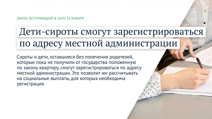 Сироты и дети, которые остались без попечения родителей, смогут прописаться по адресу местной администрации, пока не получили государственное жилье. Так они смогут получать те соцвыплаты, для которых регистрация необходима. Гражданам, которые ищут место труда, но не зарегистрированы в качестве безработных, смогут помогать с переселением в другую местность для трудоустройства. Два этих закона вступают в силу уже с 11 января грядущего года.