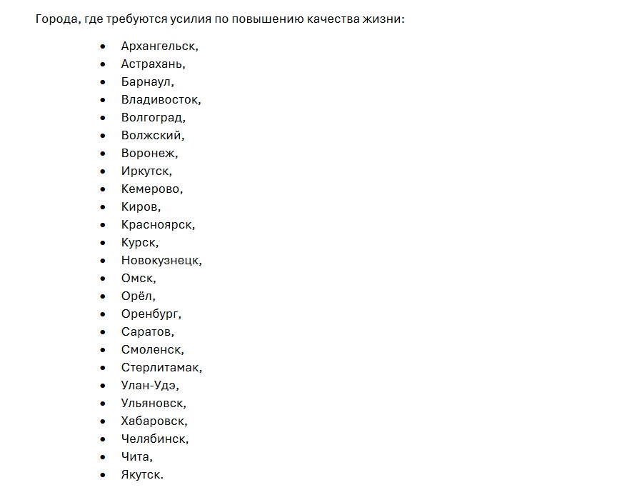 Согласно официальным данным, по итогам 1 квартала этого года, наиболее благополучными городами страны в целом стали Грозный, Москва, Сочи, Калуга, Санкт-Петербург, Владимир, Новороссийск, Екатеринбург, Севастополь и Тула.
