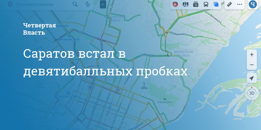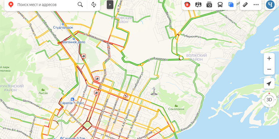 В эти минуты в Саратове наблюдаются серьезные автомобильные заторы в 9 баллов. Это следует из приложения «Яндекс.Пробки».
