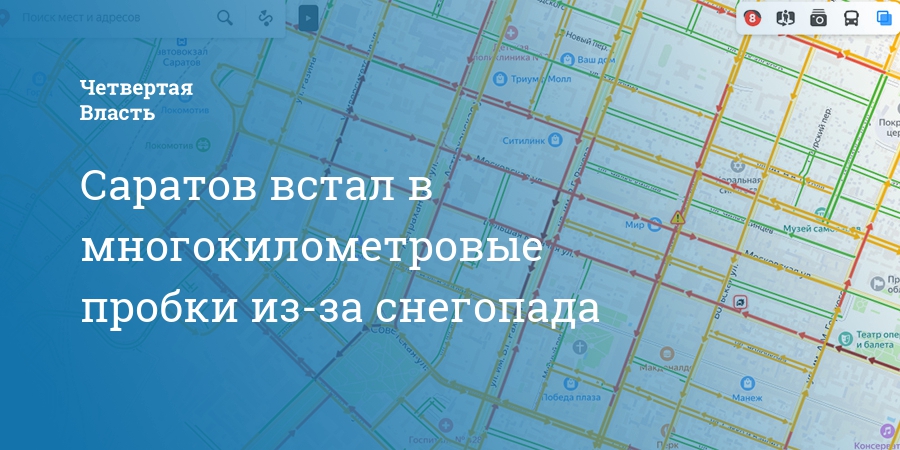 В эти минуты в разных районах Саратова из-за снегопада возникли многокилометровые пробки. Приложение «Яндекс.Карты» оценивает сложность ситуации на дорогах на 8 баллов из 10 возможных.