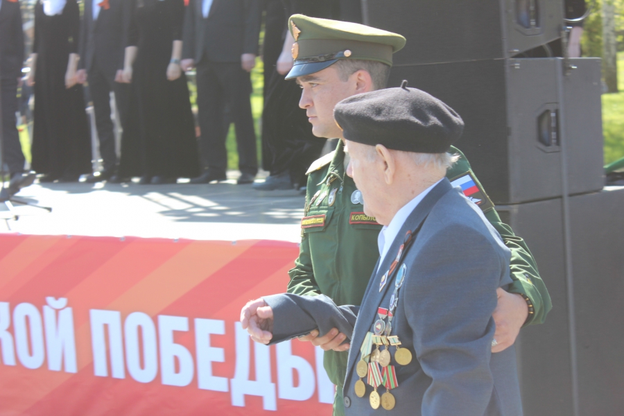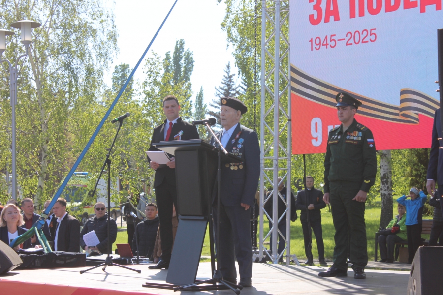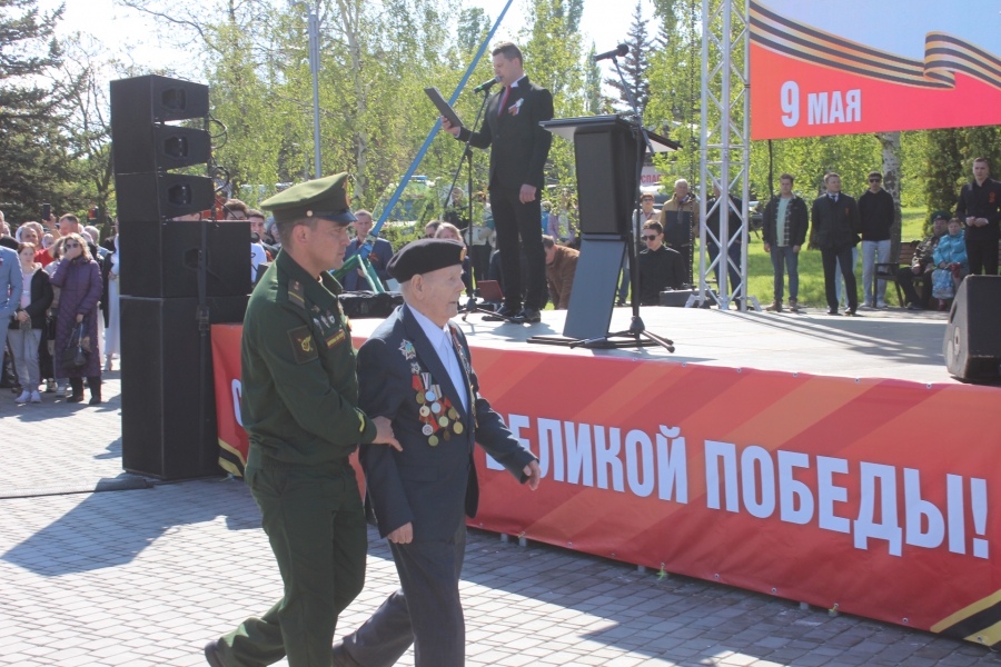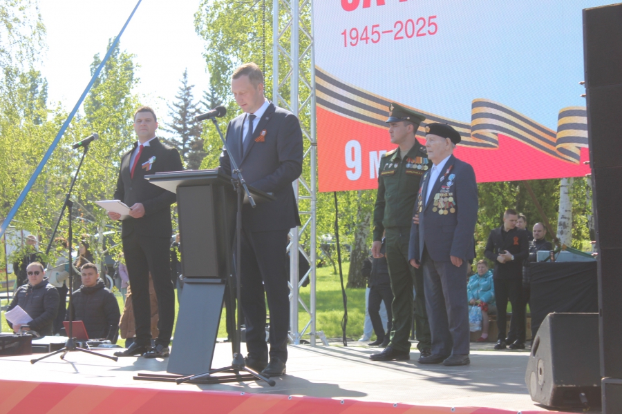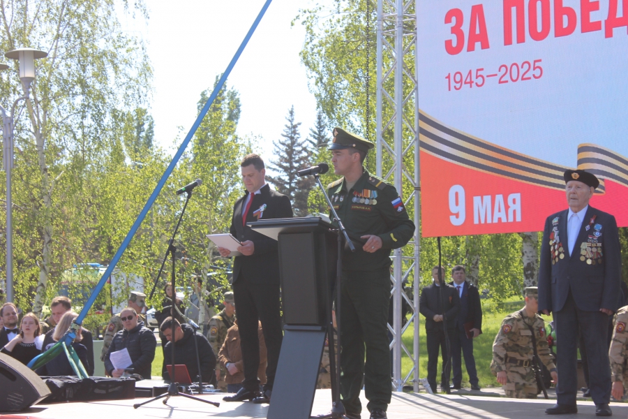 Ровно в 10.00 начался торжественный митинг, который открыл губернатор Роман Бусаргин, затем слово дали ветерану Петру Колчину. Он рассказал, как был призван в Красную Армию, когда ему еще не исполнилось 18 лет. Сначала он, как железнодорожник, попал под Ленинград, где служил на бронепоезде «Сталинец», участвовал в Курской битве, штурме Берлина. Именно в побежденной столице нацистской Германии ветеран встретил новость о конце войны. Потом выступил участник СВО Александр Копылов, он поблагодарил всех неравнодушных за ту помощь, которые они оказывают в это непростое время.