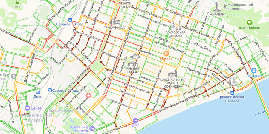 Почти «намертво» встал поток машин на улицах Астраханской, Железнодорожной, Университетской, Разина, Рабочей и Горького. Помимо этого, непросто проехать по Тракторной, Большой Казачьей, Кутякова, Емлютина, Академика Навашина и Чернышевского. В оба направления также стоит СКАД.