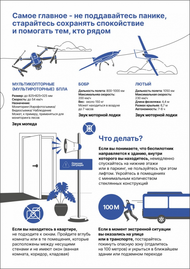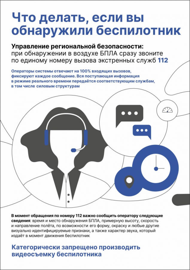 Важно сообщить о БПЛА по номерам: «112» или «659-659», указав время и место, примерный курс полета и визуальные особенности. Более подробно о мерах безопасности читайте на карточках выше.