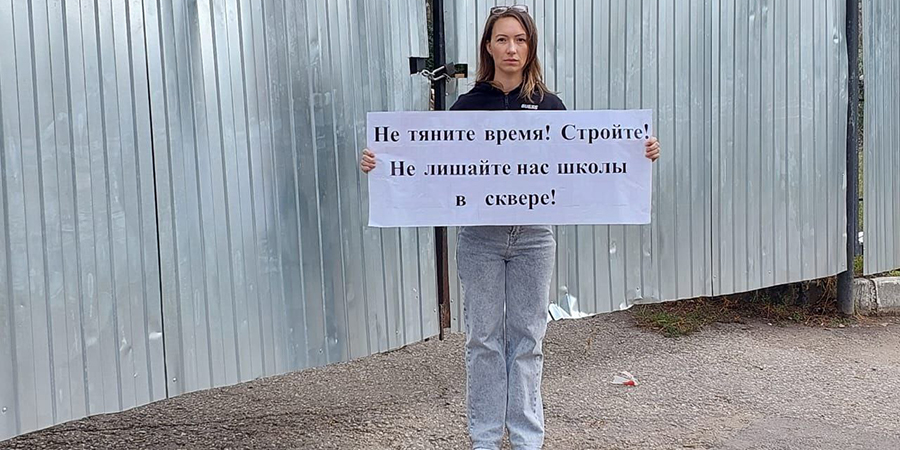 «Не тяните время! Стройте! Не лишайте нас школы в сквере!» - говорится в плакате, с которым она пришла к месту будущей стройки.