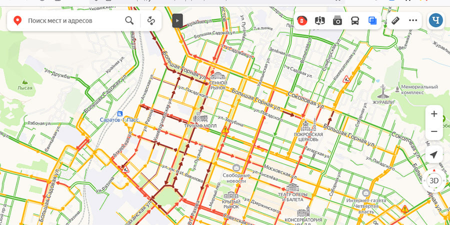 Сегодня вечером транспорт на улицах Саратова стоит в 8-балльных заторах. Об этом свидетельствуют данные приложения «Яндекс. Пробки».
